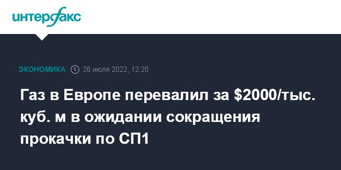 Москва. 26 июля. INTERFAX.RU - Спотовая цена газа в Европе превысила $2000/тыс. куб. м на ожиданиях выбытия из строя еще одного газоперекачивающего агрегата на "Северном потоке".
