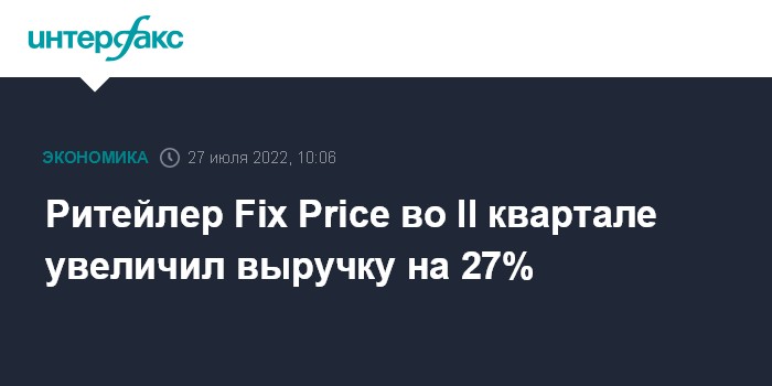 Москва. 27 июля. INTERFAX.RU - Ритейлер Fix Price, управляющий крупнейшей в РФ сетью магазинов фиксированных цен, во II квартале 2022 года увеличил выручку на 27% по сравнению с аналогичным показателем за прошлый год, до 69,2 млрд рублей.