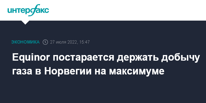 Москва. 27 июля. INTERFAX.RU - Норвежская Equinor будет стараться держать добычу газа на максимуме, но конкретные решения должны приниматься на основе бизнес-логики, заявила финдиректор компании Ульрика Ферн на телеконференции после публикации отчета за второй квартал.