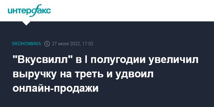 Москва. 27 июля. INTERFAX.RU - Ритейлер "Вкусвилл" в первом полугодии 2022 года увеличил выручку на 33%.
