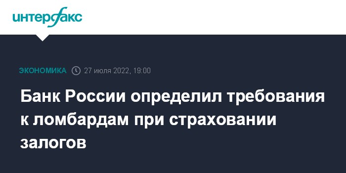 Москва. 27 июля. INTERFAX.RU - Банк России сообщил, что определил требования к обязательному набору рисков и предельный размер франшизы при страховании залогов ломбардами, они вступают в силу с 1 апреля 2023 года.
