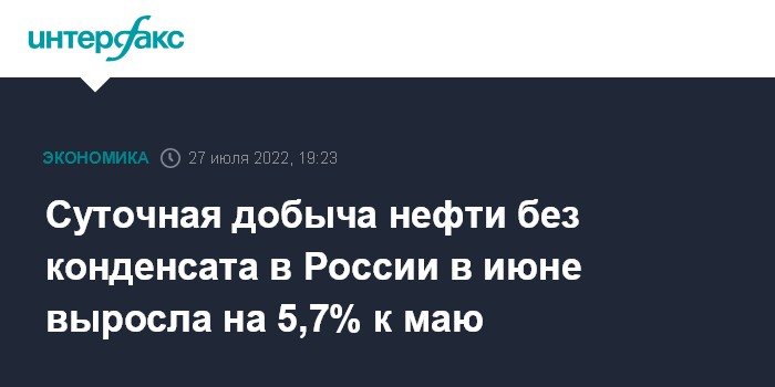 Суточная добыча нефти без конденсата в России в июне выросла на 5,7% к маю