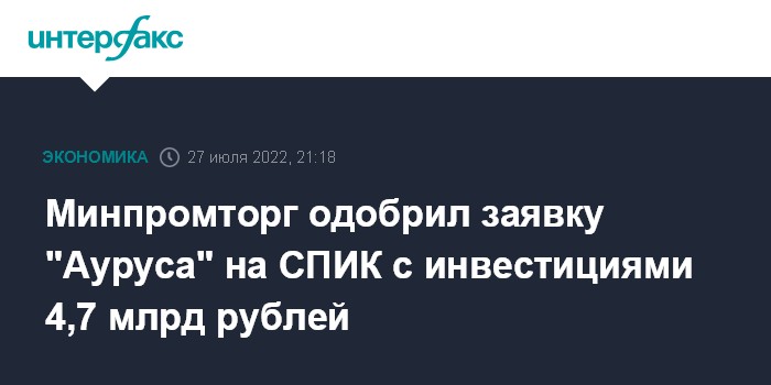 Минпромторг одобрил заявку "Ауруса" на СПИК с инвестициями 4,7 млрд рублей