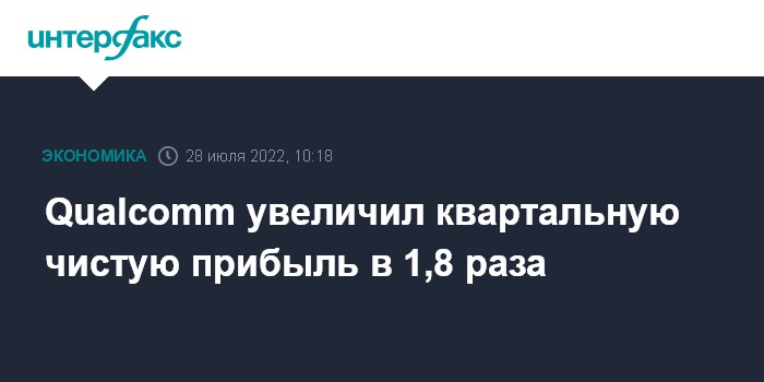 Москва. 28 июля. INTERFAX.RU - Американский Qualcomm Inc., один из крупнейших в мире производителей полупроводниковых компонентов, в третьем квартале 2022 финансового года увеличил чистую прибыль в 1,8 раза, но дала слабый прогноз на фоне снижения потребительского спроса из-за высокой инфляции.