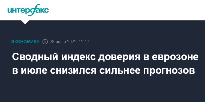 Москва. 28 июля. INTERFAX.RU - Сводный индекс делового и потребительского доверия в еврозоне в июле упал до 99 пунктов, показали данные Европейской комиссии.