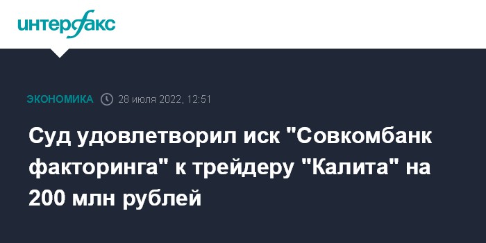 Суд удовлетворил иск "Совкомбанк факторинга" к трейдеру "Калита" на 200 млн рублей
