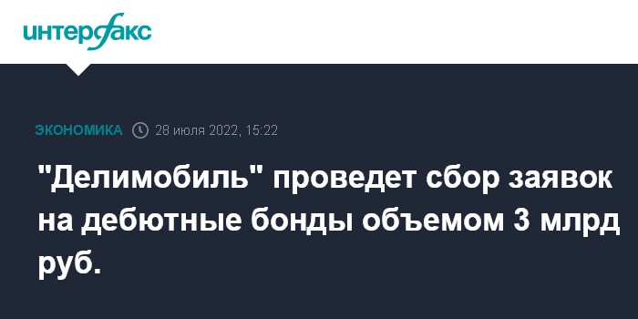 Москва. 28 июля. INTERFAX.RU - ООО "Каршеринг Руссия" (основная операционная компания каршеринга "Делимобиль") планирует с 11:00 29 июля до 15:00 5 августа провести сбор заявок инвесторов на приобретение 3-летнего дебютного выпуска облигаций серии 001Р-01 объемом 3 млрд рублей, сообщил "Интерфаксу" источник на финансовом рынке.