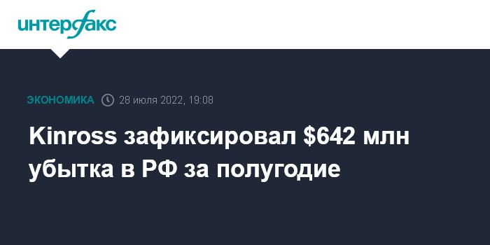 Москва. 28 июля. INTERFAX.RU - Канадский золотодобытчик Kinross Gold по итогам I полугодия получил чистый убыток от деятельности в РФ в размере $642,2 млн, говорится в материалах компании.