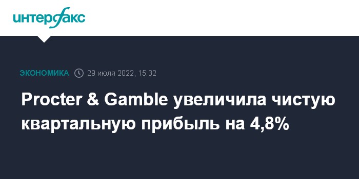 Москва. 29 июля. INTERFAX.RU - Американская Procter & Gamble Co. (P&G), крупнейший в мире производитель потребительских товаров, увеличила чистую прибыль в четвертом квартале 2022 финансового года на 4,8%, показатель в расчете на акцию оказался немного ниже прогноза.