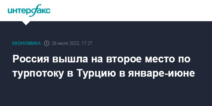 Москва. 29 июля. INTERFAX.RU - В первом полугодии 2022 года Россия заняла второе место по турпотоку в Турцию, страну посетили 1,45 млн россиян, или 8,9% всего турпотока, показывает статистика Министерства культуры и туризма страны.