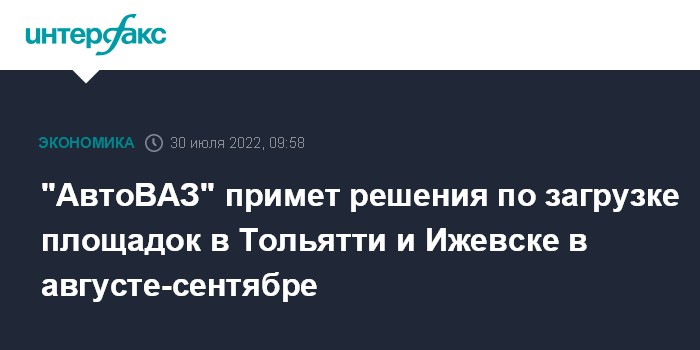 Москва. 30 июля. INTERFAX.RU - "АвтоВАЗ" формирует стратегию развития предприятия и бренда LADA, финальные решения по загрузке производственных площадок в Тольятти и Ижевске будут приняты в августе-сентябре этого года, сообщает в субботу пресс-служба главы и правительства Удмуртии со ссылкой на премьер-министра республики Ярослава Семенова.