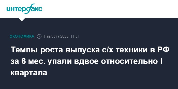 Темпы роста выпуска с/х техники в РФ за 6 мес. упали вдвое относительно I квартала