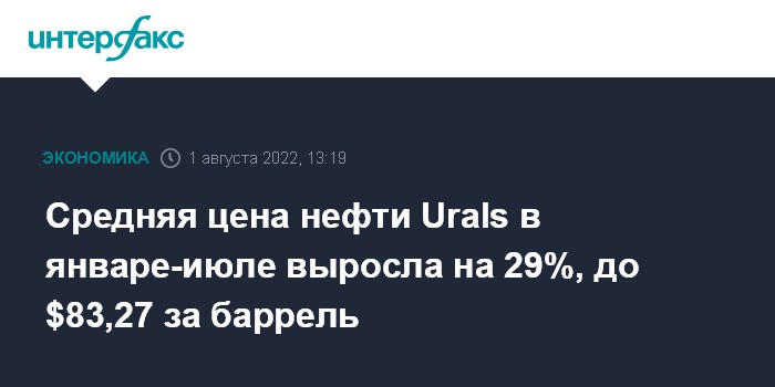 Москва. 1 августа. INTERFAX.RU - Средняя цена нефти марки Urals в январе-июле 2022 года сложилась в размере $83,27 за баррель, говорится в сообщении Минфина РФ.