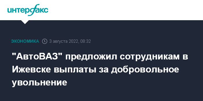 Москва. 3 августа. INTERFAX.RU - "АвтоВАЗ" предложил сотрудникам автозавода в Ижевске ("Лада Ижевск"), выпускающего модели Lada Vesta, выплату 5 окладов и дополнительную материальную поддержку, а также помощь в трудоустройстве в случае добровольного увольнения. Об этом сообщила пресс-служба компании.