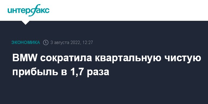 Москва. 3 августа. INTERFAX.RU - Во втором квартале 2022 года чистая прибыль германского автопроизводителя Bayerische Motoren Werke AG сократилась в 1,7 раза до 3,05 млрд евро против 4,79 млрд евро годом ранее. Компания предупредила об ухудшении обстановки на мировых рынках.