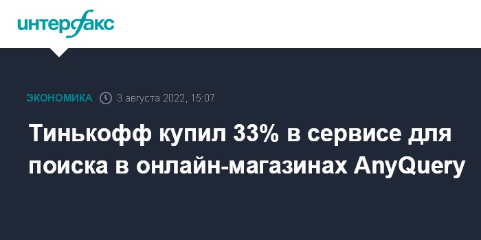 Москва. 3 августа. INTERFAX.RU - Группа "Тинькофф" приобрела 33% в сервисе поиска в интернет-магазинах AnyQuery (ранее Diginetica), сообщил сайт Тинькофф банка. Сооснователи сервиса Дмитрий Малашкин и Артем Круглов продолжат развивать компанию.