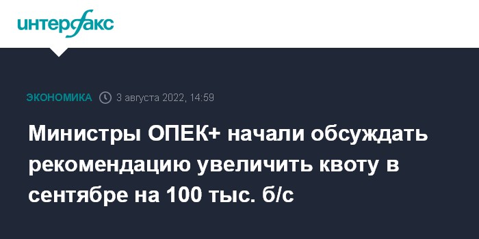 Министры ОПЕК+ начали обсуждать рекомендацию увеличить квоту в сентябре на 100 тыс. б/с