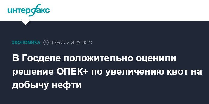 Москва. 4 августа. INTERFAX.RU - Администрация США положительно оценивает решение ОПЕК+ увеличить квоты на добычу нефти в сентябре на 100 тысяч баррелей в сутки, заявил в среду советник госдепа по энергетической безопасности Амос Хохштейн.