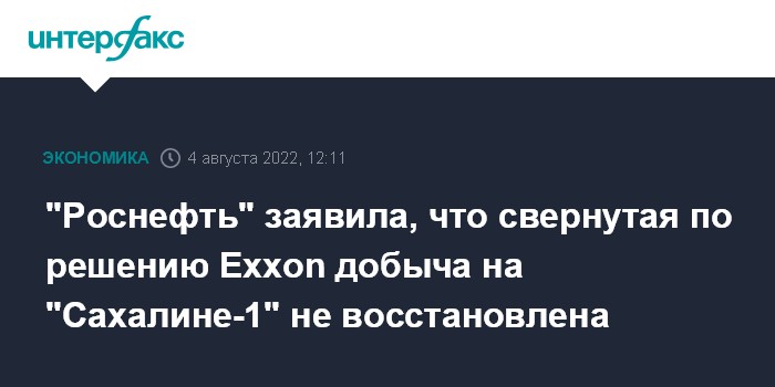 Москва. 4 августа. INTERFAX.RU - Добыча нефти в рамках СРП "Сахалин-1", свернутая по решению американской Exxon, выступающей оператором, до сих пор не восстановлена, и информации о передаче кому-либо операторских функций нет, говорится в сообщении "Роснефти", которой принадлежит 20% в проекте.