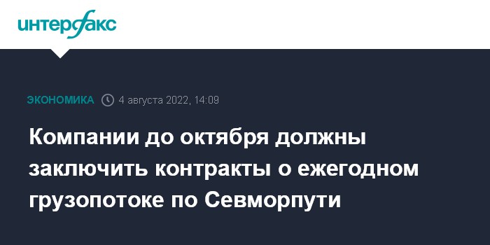 Москва. 4 августа. INTERFAX.RU - Компаниям дали время до 1 октября на заключение соглашений с Минвостокразвития о ежегодном грузопотоке по Северному морскому пути, говорится в распоряжении правительства.