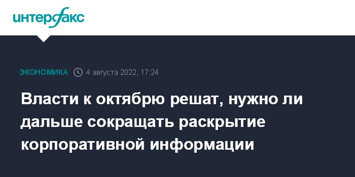 Москва. 4 августа. INTERFAX.RU - Профильные ведомства к октябрю должны решить, нужно ли продолжить сокращение раскрытия корпоративной информации, начатое в марте 2022 года в связи с резким обострением санкционных рисков.