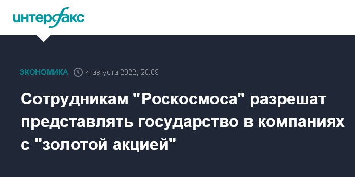 Москва. 4 августа. INTERFAX.RU - Правительство внесло в Госдуму законопроект №176873-8, который разрешит работникам госкорпорации "Роскосмос" представлять государство в совете директоров (наблюдательном совете) и ревизионной комиссии акционерного общества, в отношении которого действует специальное право - "золотая акция".