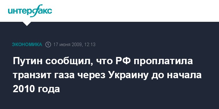 Москва. 17 июня. INTERFAX.RU - Премьер-министр РФ Владимир Путин сообщил, что Россия оплатила транзит газа в Европу через территорию Украины до начала 2010 г., перечислив Киеву $2,2 миллиарда. На встрече в среду с главой "Газпрома" Алексеем Миллером премьер подчеркнул, что "это значительные ресурсы, которые наши украинские партнеры получили фактически от России".