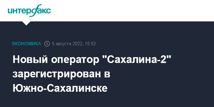 Москва. 5 августа. INTERFAX.RU - Новый оператор проекта "Сахалин-2", реализуемого на условиях соглашения о разделе продукции, - ООО "Сахалинская энергия" - зарегистрирован в Южно-Сахалинске.