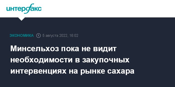 Москва. 5 августа. INTERFAX.RU - Минсельхоз РФ пока не видит необходимости в закупочных интервенциях на рынке сахара.