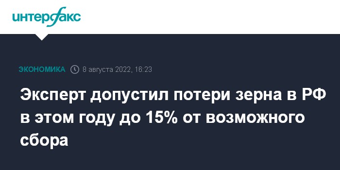 Москва. 8 августа. INTERFAX.RU - Потери зерна в РФ в этом году могут составить до 15% от возможного сбора (с учетом рефакции), прогнозирует президент Российского зернового союза Аркадий Злочевский.