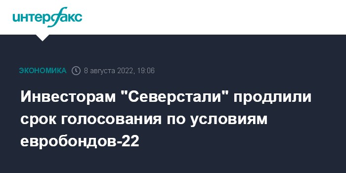 Москва. 8 августа. INTERFAX.RU - "Северсталь" продлила срок предоставления инвесторами письменного согласия на изменение порядка обслуживания долларовых еврооблигаций компании с погашением в 2022 году до 16 августа (16:00 по Лондону), говорится в ее сообщении.