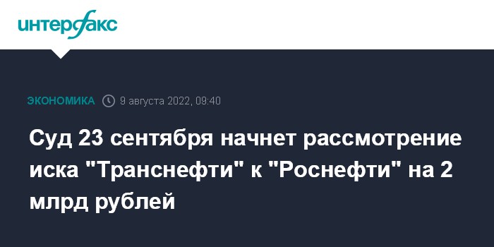 Москва. 9 августа. INTERFAX.RU - Арбитражный суд Москвы назначил на 23 сентября рассмотрение иска ПАО "Транснефть" к ПАО "Роснефть" на 2 млрд рублей, сообщается в картотеке арбитражных дел. Категория иска - "О неисполнении или ненадлежащем исполнении обязательств по договорам хранения".