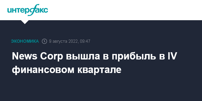 Москва. 9 августа. INTERFAX.RU - Американская медиакомпания News Corp в четвертом финансовом квартале (апреле-июне 2022 гоад) получила чистую прибыль и нарастила выручку на 7,3%.