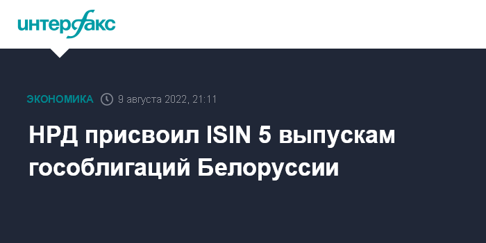 Москва. 9 августа. INTERFAX.RU - "Национальный расчетный депозитарий" (НРД) присвоил ISIN (международный идентификационный код) 5 выпускам облигаций Минфина Белоруссии (серий 8-12), следует из сообщений НРД.