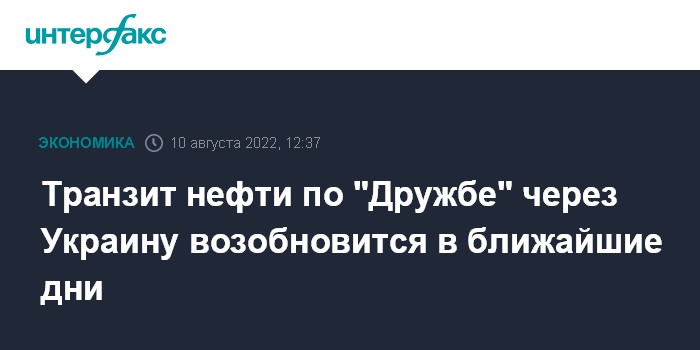 9 августа стало известно, что поставки российской нефти по "Дружбе" через Украину прекращены с 4 августа из-за проблем с проведением платежей за транзит на фоне санкций. Российская "Транснефть" сообщала, что 22 июля украинской стороне был переведен платеж за август, но деньги вернулись на счет "Транснефти" 28 июля при том, что европейские регуляторы не согласовали алгоритм действий для банков различных юрисдикций в такой ситуации.