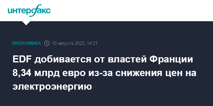 Москва. 10 августа. INTERFAX.RU - Французская энергетическая компания Electricite de France SA запросила у своего основного акционера - правительства Франции - 8,34 млрд евро в качестве компенсации за то, что власти обязали ее продавать электроэнергию потребителям по сниженной цене в связи с ростом инфляции.