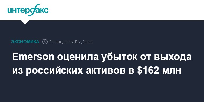 Москва. 10 августа. INTERFAX.RU -Американская инжиниринговая Emerson списала $162 млн в связи с объявленным в мае выходом из российских активов, сообщается в отчете корпорации.