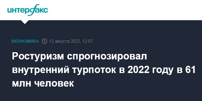Москва. 12 августа. INTERFAX.RU - В России с начала года уже отдохнули более 34 млн человек, это даже чуть больше показателя доковидного 2019 года, а по итогам 2022 года внутренний турпоток составит 61 млн человек, сообщила на совещании по развитию туризма глава Ростуризма Зарина Догузова.