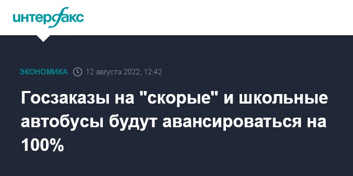 Москва. 12 августа. INTERFAX.RU - Госконтракты на поставку в регионы автомобилей скорой помощи и школьных автобусов, исполнителями которых традиционно выступают группа "ГАЗ" и входящий в "Соллерс Авто" УАЗ, в 2022 году будут авансироваться в размере 100% от стоимости, следует из проекта постановления Минпромторга.