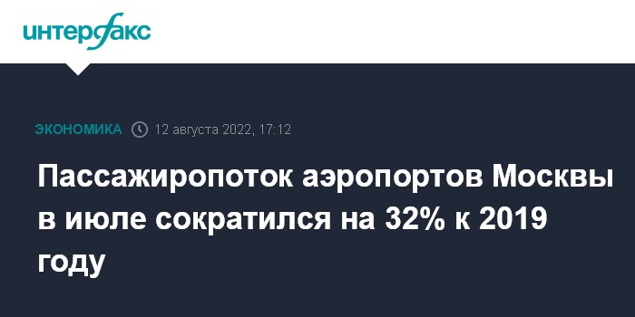 Москва. 12 августа. INTERFAX.RU - В июле 2022 года пассажиропоток аэропортов Московского авиаузла - "Шереметьево", "Домодедово" и "Внуково" - сократился к июлю 2021 года на 5%, следует из сообщения департамента транспорта Москвы. По сравнению с июлем доковидного 2019 года он уменьшился на 32%.