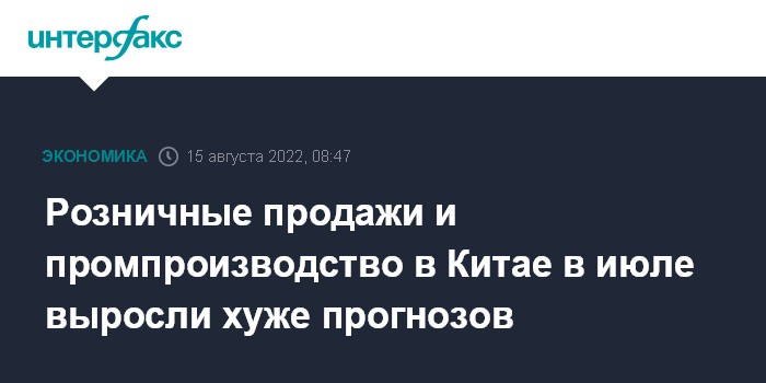 Москва. 15 августа. INTERFAX.RU - В Китае в июле розничные продажи и объем промышленного производства выросли хуже прогнозов аналитиков на фоне шаткого восстановления китайской экономики после пандемии из-за сохранения политики нулевой терпимости к COVID-19.