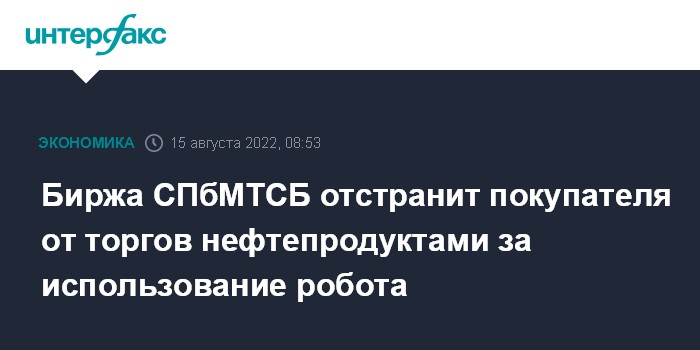 Москва. 15 августа. INTERFAX.RU - Совет секции "Нефтепродукты" Санкт-Петербургской международной товарно-сырьевой биржи (СПбМТСБ) впервые рекомендовал бирже применить в качестве наказания временное отстранение от торгов компании-покупателя за использование роботов.