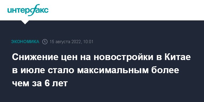 Москва. 15 августа. INTERFAX.RU - Снижение цен на новостройки в Китае в июле 2022 года стало максимальным более чем за шесть лет на фоне сохраняющегося кризиса в секторе недвижимости страны и снижения доверия китайских покупателей к застройщикам, подсчитала The Wall Street Journal по данным Государственного статистического управления (ГСУ) КНР.