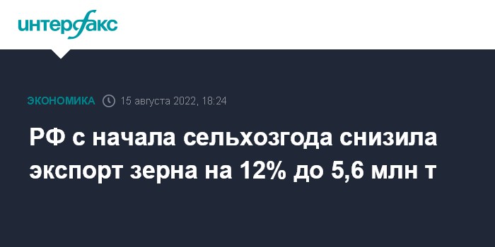 Москва. 15 августа. INTERFAX.RU - РФ за полтора месяца текущего сельхозгода (начался 1 июля) экспортировала 5,6 млн тонн основных зерновых культур (пшеница, ячмень и кукуруза), что на 12% меньше, чем годом ранее, следует из мониторинга Российского зернового союза.