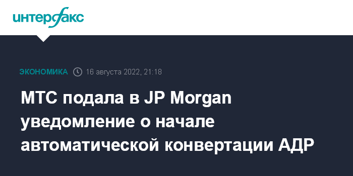 Москва. 16 августа. INTERFAX.RU - ПАО "МТС" подало в банк-депозитарий JP Morgan (ООО КБ "Дж.П. Морган Банк Интернешнл") уведомление о начале автоматической конвертации американских депозитарных расписок в обыкновенные акции, сообщил оператор.