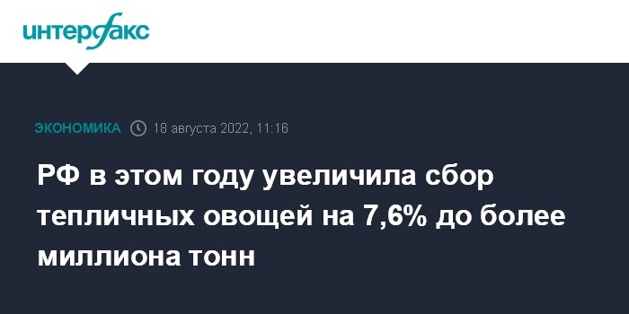 Москва. 18 августа. INTERFAX.RU - Сбор тепличных овощей в РФ с начала года составил более 1 млн тонн, что на 7,6% больше, чем годом ранее, сообщает Минсельхоз.
