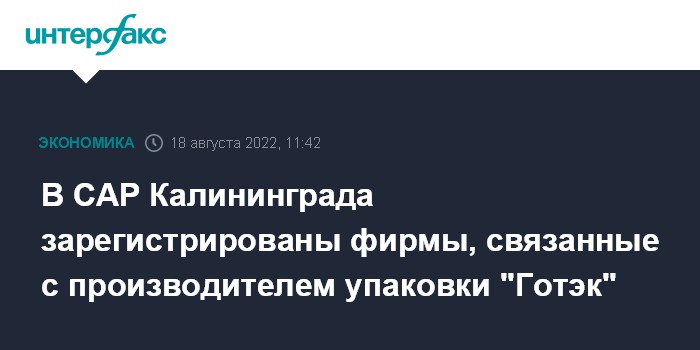 Москва. 18 августа. INTERFAX.RU - Две компании, связанные с крупным российским производителем упаковочных материалов "Готэк", зарегистрированы в специальном административном районе (САР) в Калининградской области, свидетельствуют данные аналитический системы "СПАРК-Интерфакс".