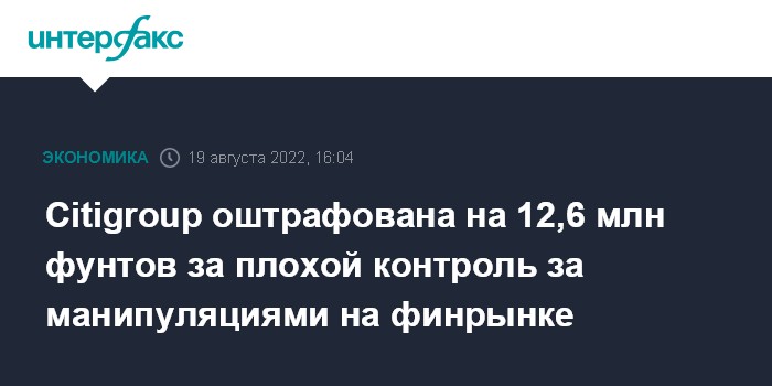 Citigroup оштрафована на 12,6 млн фунтов за плохой контроль за манипуляциями на финрынке