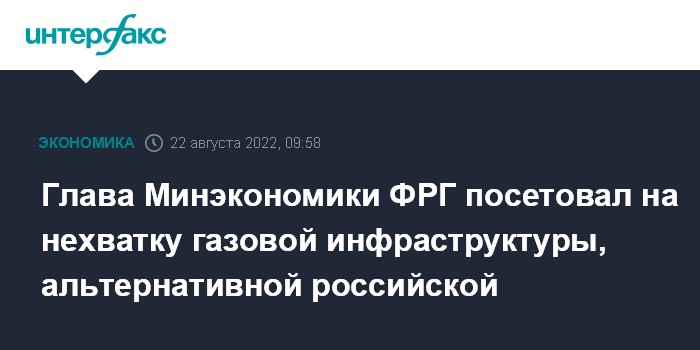 Москва. 22 августа. INTERFAX.RU - Основная проблема для немецкой энергетики в данный момент - это нехватка инфраструктуры, которая позволила бы ФРГ быть независимой от РФ, заявил в ходе визита в Канаду глава Минэкономики Германии Роберт Хабек.