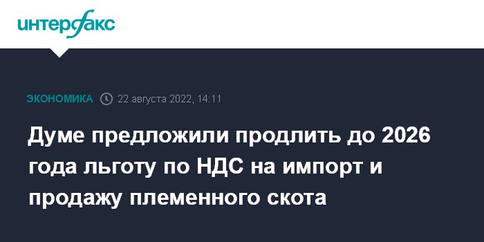 Москва. 22 августа. INTERFAX.RU - В Госдуму внесен законопроект № 184193-8 о продлении нулевого НДС при продаже и импорте племенного скота до 31 декабря 2025 года, пока эта льгота действует до 31 декабря 2022 года.